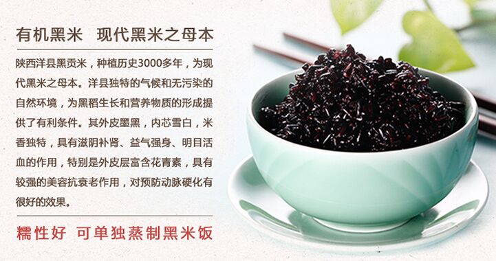 洋县的原生态环境被保护的十分完好,各种野生动植物十分丰富,这也为当地原生态农业发展提供了良好的空间。黑米稻谷正是在这样优良的环境中孕育的,据本草纲目记载:此黑米主治“走马喉痹,调中气,主骨节风,瘫痪不遂,常年白发”症,有滋阴补肾、健脾开胃、补中益气、活血化瘀等功效。