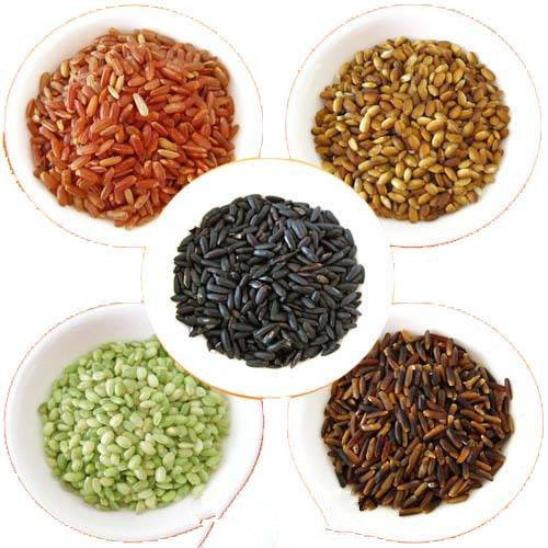 陕西省洋县五彩稻米是由洋县黑米、红香米、 黄香米、绿香米和紫香米五种不同颜色的稻米组 合而成,该稻米系糙米,天然色泽。以黑米为主的 五彩稻米种植历史悠久,营养丰富,常年种植面积 2 667hm2。