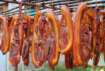 镇巴民族园农家乐厨师 :这个就是我们做菜板肉的五花肉,在腌制的时候不要放的太咸,也不要放得太淡,熏的时候就是用老百姓家的柴火,好是柏桠,炖菜主要用盐排骨和腊猪蹄。