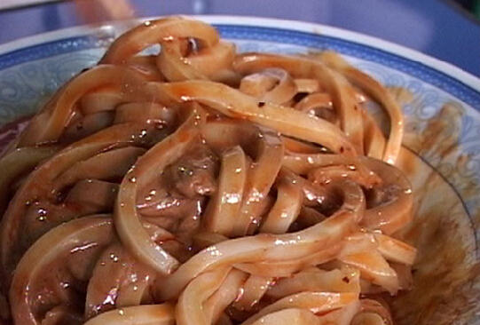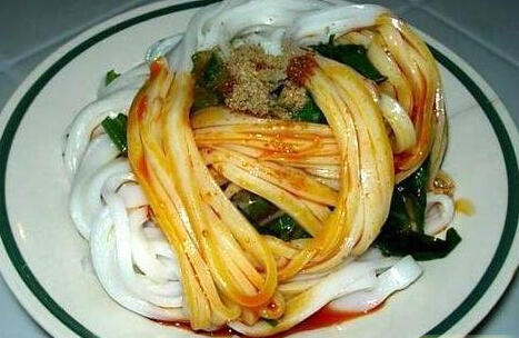 这一碗是在陕西关中一代流行的凉皮。制作方式是先把面粉和面,在水中搓洗,清洗出面筋,再用洗好的粉浆上笼蒸制而成。 “辣子多醋多”是食客们常给凉皮店老板说的一句话。