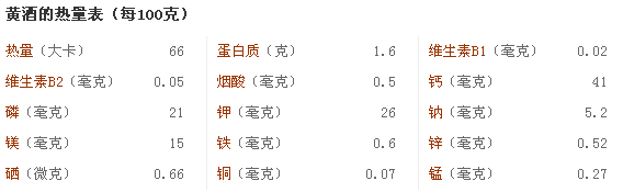 黄酒含有许多易被人体消化的营养物质,如:糊精.麦芽糖、葡萄糖、脂类.甘油、高级醇、维生素及有机酸等。这些成分经贮存,终使黄酒成为营养价值高的低酒精度饮品。