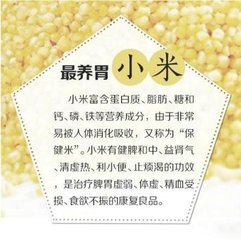 营养价值:小米具有健脾和胃、补益虚损、除热解毒的功效,还有一定的安神作用。但它的氨基酸组成并不理想,不能完全作为主食,要搭配其他谷物。