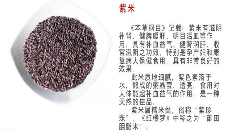 味甘,性平,归肝脾经,所含B族维生素、铁、钙、磷、硒、镁、铜、锌等营养物质的含量都比白米高,经常食用能补血益气、滋阴补肾、健脾暖肝、明目活血。