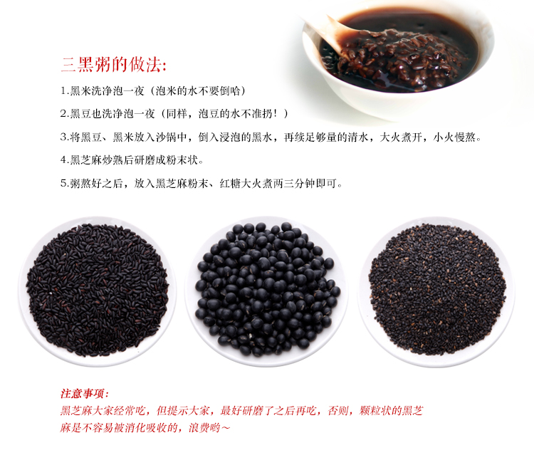 大家对于黑豆黑芝麻黑米这三种食材肯定是非常熟悉的吧,我们采用了黑豆和黑芝麻搭配上黑米不但外观是非常好看,而且味道也是一流的,用这三种黑色的食材来煮粥,不但可以起到很好的养生保健功效,而且还能发挥到美容和瘦身的效用。