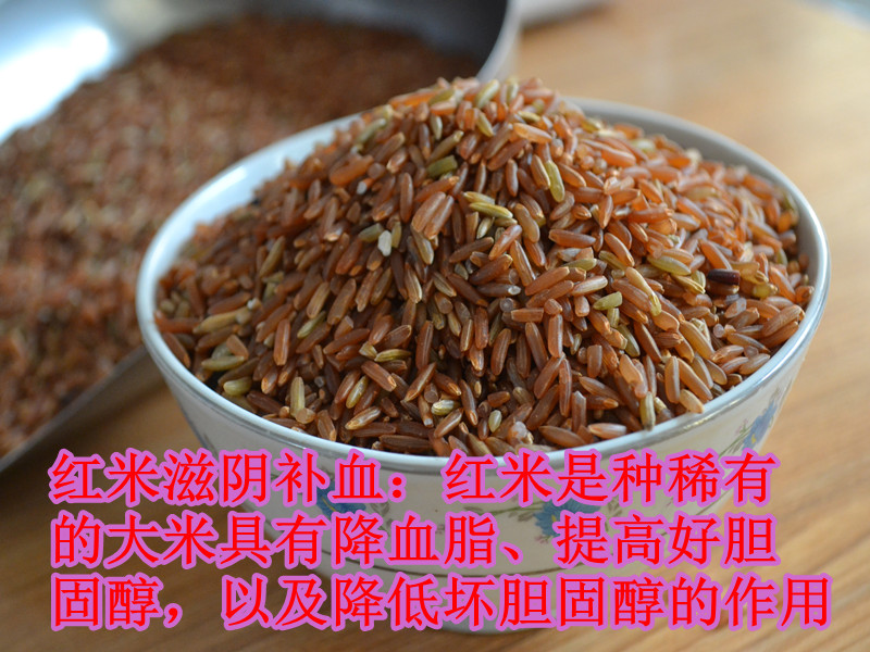 红米含有丰富的淀粉与植物蛋白质,可补充消耗的体力及维持身体正常体温。它富含众多的营养素,其中以铁质为丰富,故有补血及预防贫血的功效。而其内含丰富的磷,维生素A、B群,则能改善营养不良、夜盲症和脚气病等毛病;又能有效舒缓疲劳、精神不振和失眠等症状。所含的泛酸、维生素E、谷胱甘滕胺酸等物质,则有抑制致癌物质的作用,尤其对预防结肠癌的作用更是明显。
