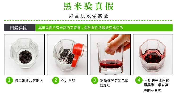 第四招看泡米水。正常黑米的泡米水是紫红色,稀释以后也是紫红色或偏近红色。如果泡出的水像墨汁一样,经稀释后还是黑色,就是假黑米。