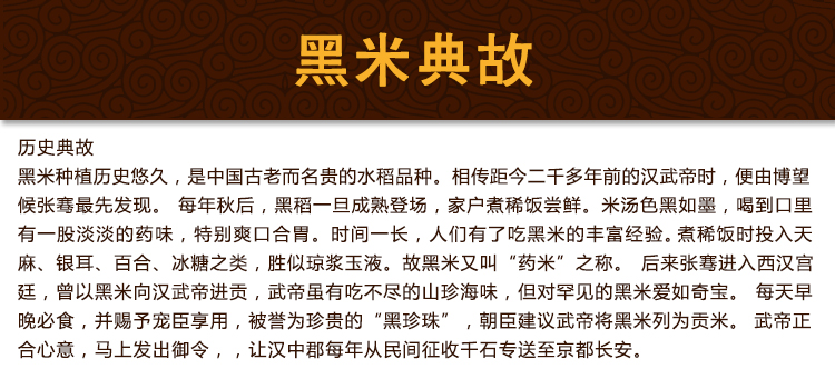 洋县黑米历史悠久。据《洋县志》记载,黑稻原产洋县,据传系公元前140年(建元元年)的西汉博望侯张骞选育而成。他将其奉于武帝,帝大悦,遂列为“贡品”。自汉武帝以来,历代帝王都将洋县黑米列为“贡品”,而成为皇室的珍肴美味。清光绪二十四年(1898年)“庚子之变”,尽管慈禧太后如丧家之犬逃到西安,仍念念不忘洋县黑米的滋补奇效和诱人香味,亲自下旨,令汉中知府进献。