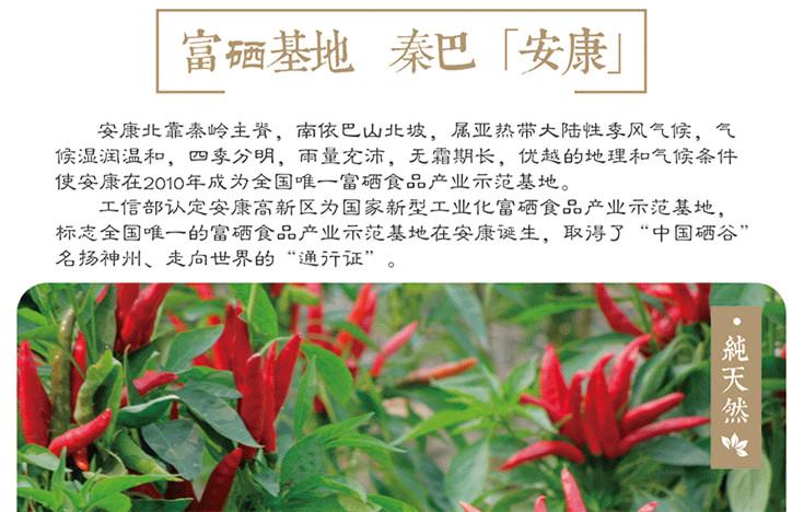 经现代科学研究,陕南石泉为长江上游水源地,气候适宜,水质纯净、泥土含硒量丰富,所产的辣椒辣感适中,香中带甜,经陕西正康富硒食品开发公司传统工艺加工后的“鬼谷子”搨辣子,富含天矿物质和维生素,是现代居家旅行、饮食养生的必备保健食品。