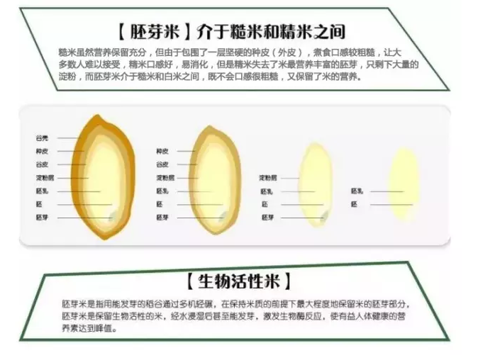 糙米虽然营养保留充分,但由于包围了一层坚硬的种皮(外皮),煮食口感较粗糙,让大多数人难以接受,精米口感好,易消化,但是精米失去了米营养丰富的胚芽,只剩下大量的淀粉,而胚芽米介于糙米和精米之间,既不会口感很粗糙,又保留了米的营养。