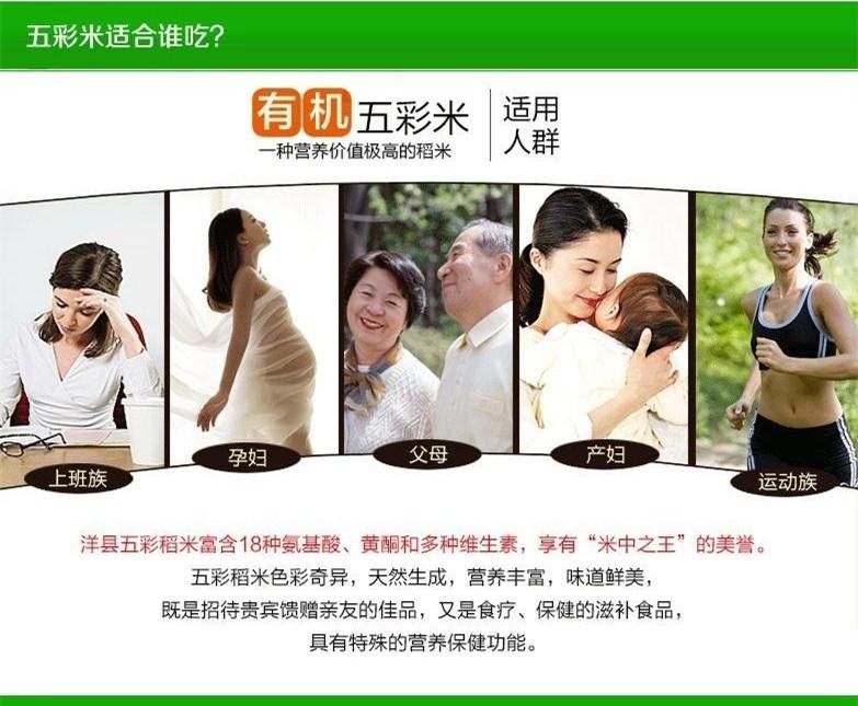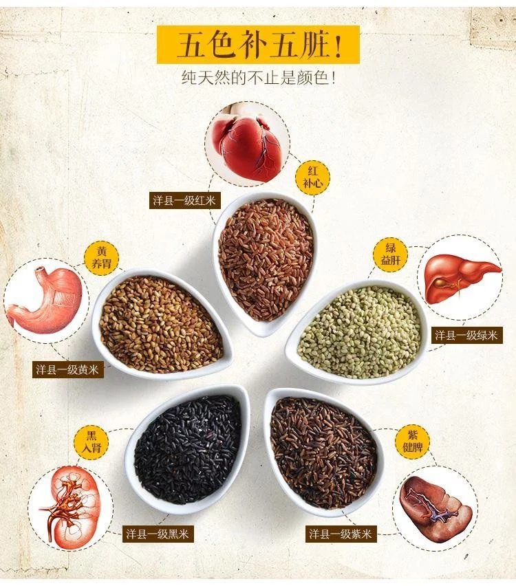 依据医学药食同源基本理论,天然食物的颜色与功能相关,黑色补肾,白色润肺,红色补心,黄色益脾,紫色养肝,绿色健体。随着绿色产业的发展,洋县正以独特的生态环境,大力发展以五彩米为主的生态米生产,不断满足人对特种米的需求,满足人们对高质量生活保健的追求。