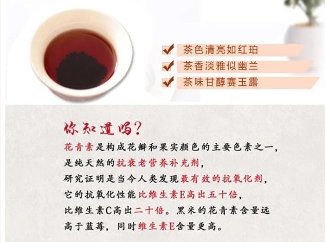 黑米茶中富含大量花青素,是纯天然的营养补充剂,研究证明是当今人类发现有效的抗氧化剂,它的抗氧化性能比维生素E高出五十倍,比维生素C高出二十倍。常喝黑米茶,美容养颜乌发,健康新选择。开水冲泡3分钟,茶色清亮如红珀,茶香淡雅如幽兰,茶味甘醇如玉露,真是好看又好喝。