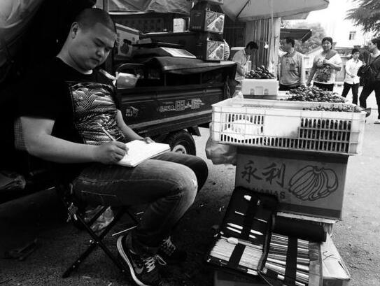 卖水果是个并不轻松的工作,每天早上8点出摊,晚上11点收摊,全年无休。生意好时,你得招呼顾客;生意不好,也得守着摊,不能离开。“所以就画画,每天下午人都不多,我能画一两个小时。”