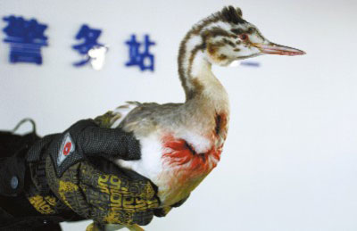 21日16时许,市民在高新区(新市区)宁波街路边捡到一只受伤的鸟,发现鸟的胸口和脖颈处有伤,长得像鸭却又不同,便立即把鸟交给在宁波街执勤的民警周耀。