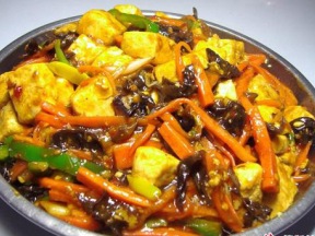5、热锅凉油,放入蒜末爆香,放胡萝卜、木耳翻炒,听到木耳爆出响声,放豆腐翻炒至金黄色。