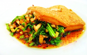 “恋爱豆腐果”是贵阳有名的风味小吃。它由切成长方形小块的白豆腐,经适量碱水发酵后,放在有眼铁片上烤制并填料而成的。