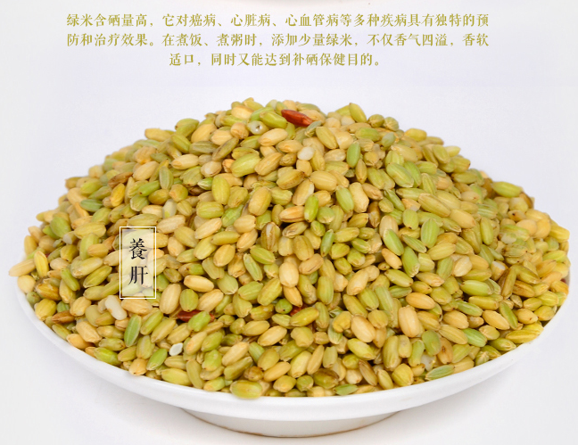 【洋县绿粳米简介】 御品香米坊(www.ypxmf.com)经营的御品绿粳米其米质优良,外观独特,气味芳香,营养丰富,特别是含硒量高。绿香粳糯米富含维生素K,脂肪和叶绿素、膳食纤维高,尤其是硒含量每百克高达23.2毫克,对癌症、心脏病、心血管病、肝炎、胃炎、支气管炎、胃溃疡、风湿性关节炎、哮喘、高血压、糖尿病、白内障及不育症等40多种疾病都具有一定的预防和治疗效果。 【洋县富硒绿米价格】 御品香米坊所经营的富硒绿米为原产地农户供货,厂家直销,零售价格为15元/500g,真空包装,不含运费,运费根据快递公司收费情况,酌情优惠。 【洋县富硒绿米批发】 一次购买100袋以上可运费,大量采购可享受10-15元/500g(含物流运输费,客户自提减运费)的批发价,具体情况电议。 【洋县富硒绿米在线订购】 在线购买御品富硒绿米请点击微店链接http://weidian.com/?userid=432211361或通过扫描或识别下方二维码,登录我的微店“御品坊”美食特产馆直接购买,御品富硒绿米批发,请先通过客服电话或者微信等方式,协商好价格及运输方式等事宜再下单。有问题随时通过在线客服(微信号:hzmstcf88或QiuShuiYiRen1986), (扫一扫或长按识别图中二维码) 【洋县富硒绿米的营养价值】 御品富硒绿米营养成分 植物蛋白、粗脂肪、膳食纤维、多种维生素、尼克酸,硒、磷、铁、钙、锌等微量元素。 御品富硒绿米食用价值 百克御品富硒绿米中,含硒量高达23.2毫克。硒是人体必需的营养元素,是一种抗氧化剂,作用与维生素相似,但效力更大。硒是谷胱甘肽过氧化物酶的组成成分,能防止不饱和脂肪酸的氧化,抑制对机体有损害作用的过氧化物和自由基的产生,保护细胞受损害,保护疫系统、防治癌症、防止女性更年期发热潮红及更年期的其他疾病、预防心脏病及血液循环方面的疾病、防治头皮屑等有一定作用,补硒往往能提高癌症病人的存活率。在煮饭、煮粥时,添加少量绿米,不仅香气四溢,香软适口,同时又能达到补硒保健目的。