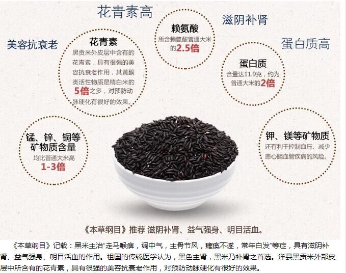 医学临床报告显示黑米表皮中的花青素可促进视网膜细胞中视紫质(Rhodopsin)的再生成,可预防重度近视及视网膜剥离,并可增进视力。