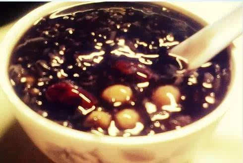 2.先将黑米与粳米一起放入清水中淘洗干净,加清水适量,煮约1小时后,加入黄豆、红枣及洗净的芝麻,继续煮约30分钟即可。